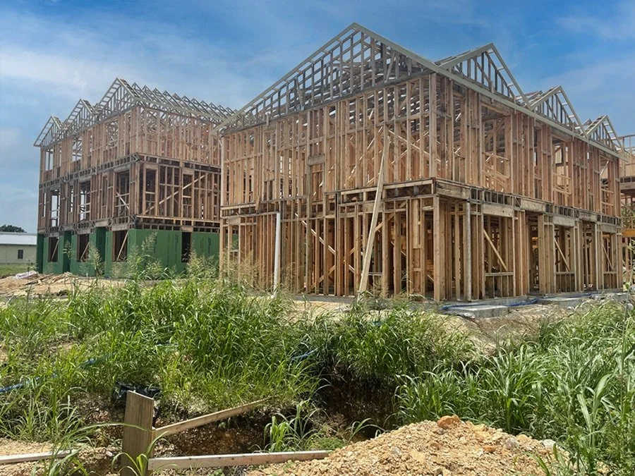 Framing is finishing up for Phase I homes and the outlines of our little pocket neighborhood are emerging. The exterior building envelope is now underway with sheathing installation in progress. Once this outer shell is in place, roofing, balconies, and windows will start arriving on site to complete the air and weather barrier before exterior finishes are installed and interior work can begin.