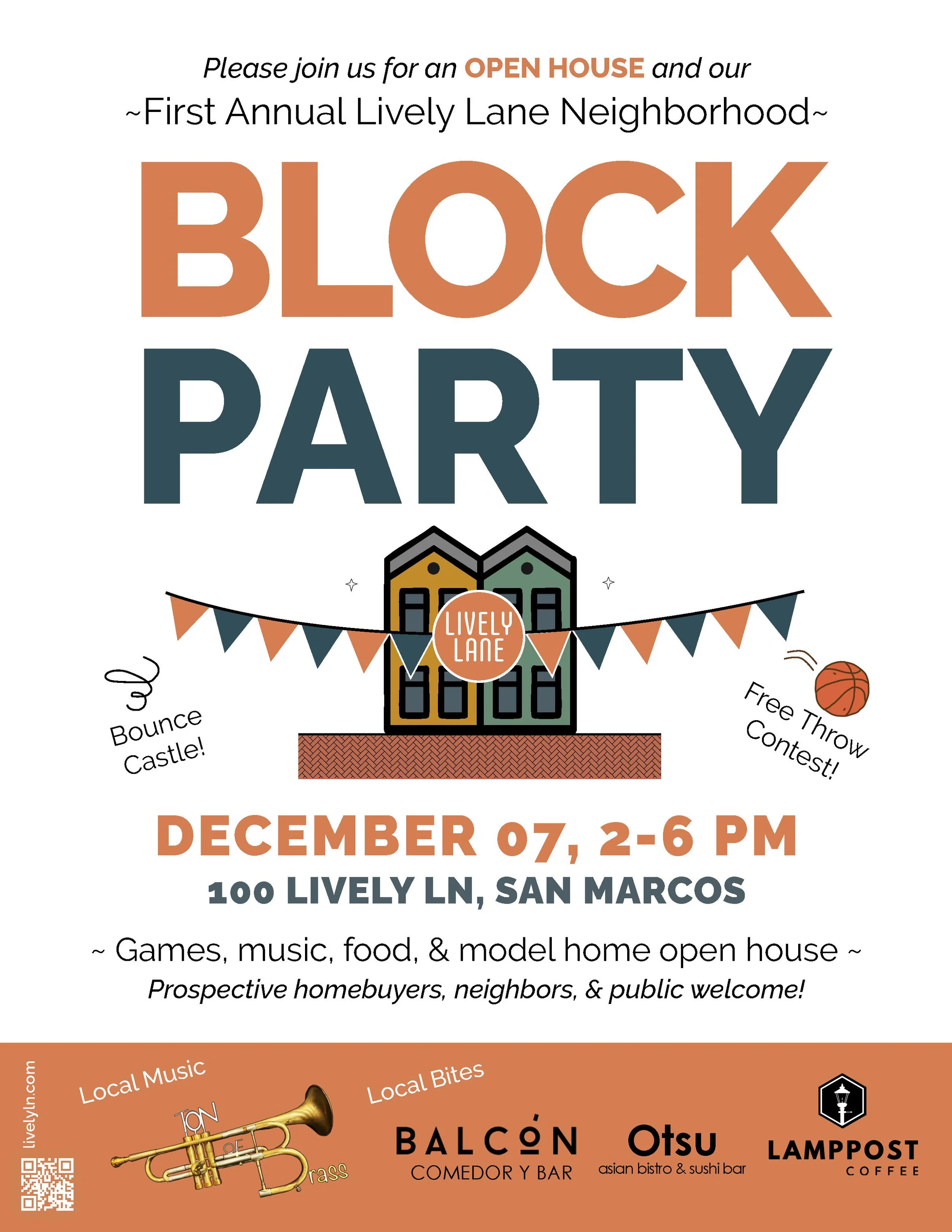Join us on Sunday December 7th from 2 - 6 PM for the our first annual Lively Lane neighborhood block party. All are welcome, including prospective homebuyers, neighbors, and the general public. Enjoy local music, food, games, and tour one of our new homes!