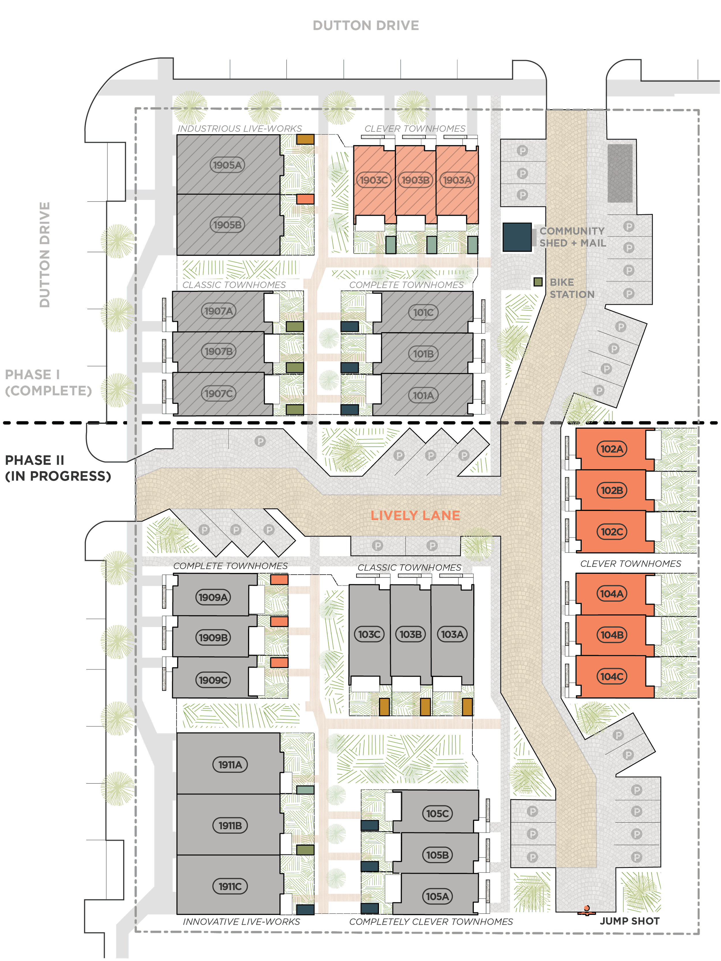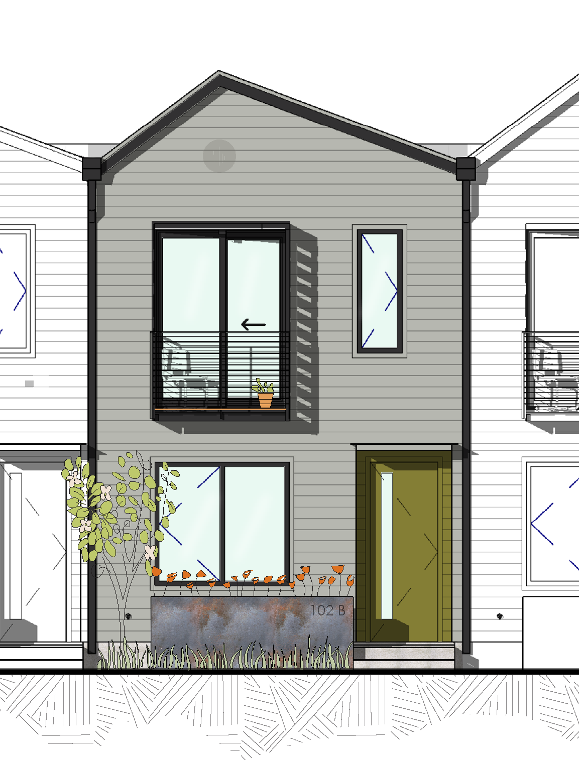 The Clever Townhome is a sensible home designed to provide for daily necessities in a cozy two-floor layout suitable for an individual, couple, or small family. Living and kitchen activities situate downstairs away from the quiet of the bedrooms above. Vaulted ceilings and a main bedroom balcony open up the second floor; and a full bath maximizes functionality with a separate toilet closet and integrated washer/dryer. A welcoming entry planter and rear patio create opportunities to test your green thumb and relax outdoors. 1903 Dutton homes include a private, fenced rear garden and a custom-designed bike/storage shed. 102 and 104 Lively Lane models include a larger private, fenced rear garden. Dreaming of this townhome? Aren’t you Clever.