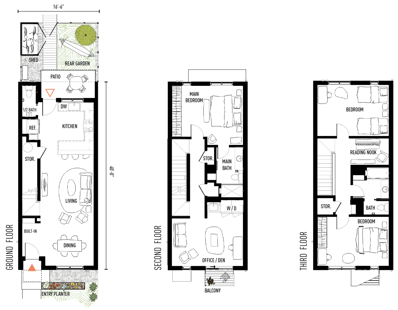 The Complete Townhome accommodates a full house. The open-plan ground floor provides ample space for dining, living, and kitchen activities with a half-bath for convenience or guests. On the second floor, a distinguished main bedroom with ensuite bath and walk-in shower is joined by a flexible den space that includes a tuckaway wet sink and washer dryer. The top floor features vaulted ceilings, a cozy reading nook, shared bath with separate toilet closet, and two additional sleeping quarters. A welcoming entry planter and a private, fenced rear garden create opportunities to test your green thumb or relax outdoors, and the custom-designed storage/bike shed helps keep everything in its right place. This townhome says, “you complete me.”