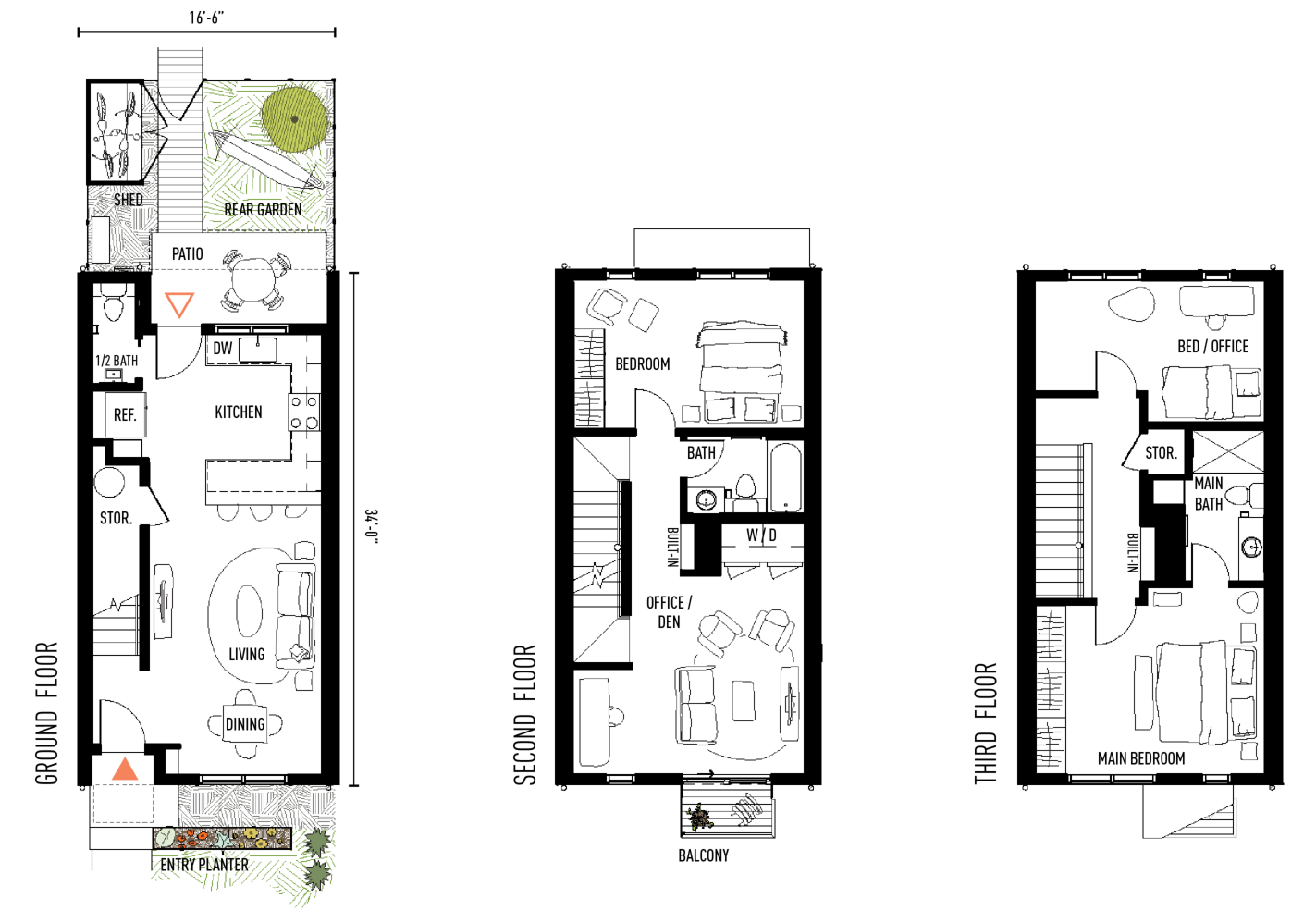 The Completely Clever Townhome is a mashup of our Clever and Complete models, offering a three story layout within a more efficient footprint. Primary living and kitchen activities situate downstairs; a bedroom and flexible den space with balcony occupy the second floor; and the top floor features vaulted ceilings at the main bedroom and a bonus bedroom or office. A welcoming entry planter and private, fenced rear garden create opportunities to test your green thumb or relax outdoors, and the custom-designed storage shed helps keep everything in its right place. See yourself in this home? How completely clever.